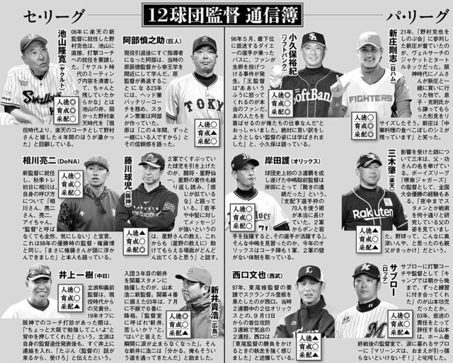 日ハム・新庄剛志監督とソフトバンク・小久保裕紀監督は“諸刃の剣”「プロ野球12球団」監督の“裏”通信簿【パ・リーグ編】 ピンズバNEWS編集部 2026.4.27 野球 (3/3ページ) 1ページ目から読む ■【画像】一覧表「プロ野球12球団」監督の“裏”通信簿 番記者や専門家が徹底分析した「プロ野球12球団」監督の“裏”通信簿の一覧表。このページをブックマークして、シーズン中盤からシーズンオフに検証してみるのもオススメです。 画像作成/編集部 この画像の記事を読む プロ野球12球団監督「采配・人望・師の教え」“裏”通信簿 巨人・阿部慎之助監督が「仏になった理由」を番記者や専門家が徹底分析「プロ野球12球団」監督の“裏”通信簿【セ・リーグ編】 1 2 3