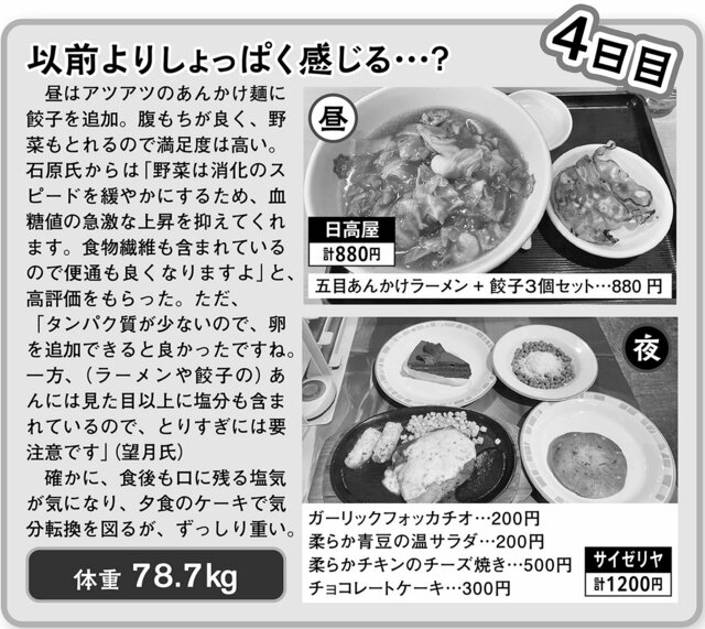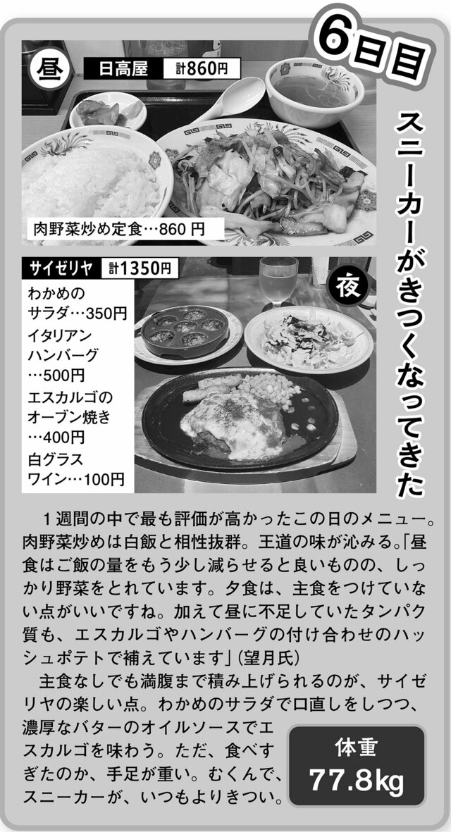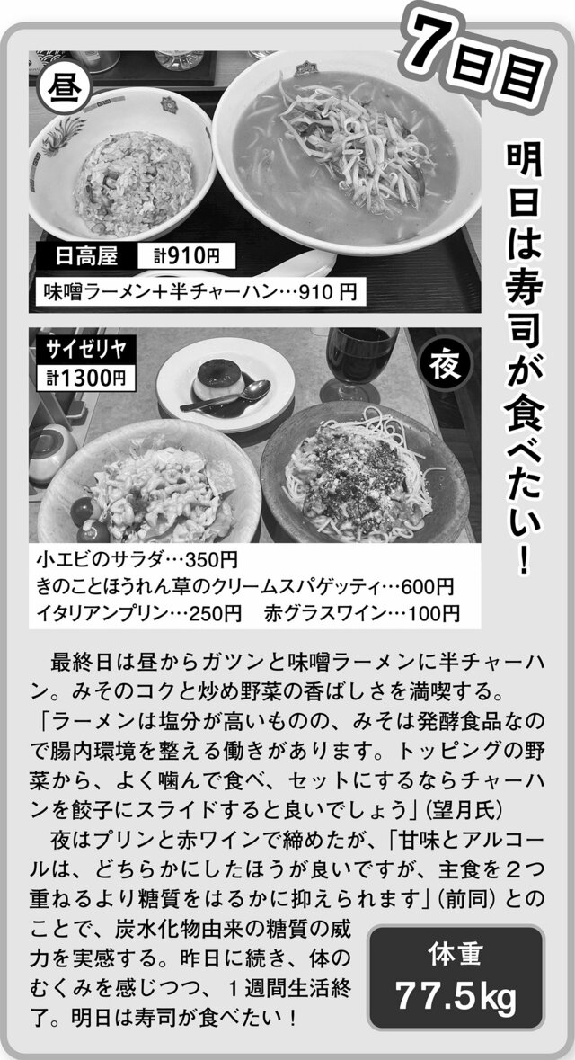 本サイト記者がガチンコ実食した体験レポートで驚きの結末が…1週間「日高屋&サイゼリヤだけ生活」【後編】 ピンズバNEWS編集部 2026.4.29 グルメ 健康 ライフ (3/3ページ) 1ページ目から読む ■【画像】本サイト記者が実食した4日目から最終日までのメニュー 日高屋&サイゼリヤだけで1週間食生活。 4日目のメニュー ※画像作成/編集部 5日目のメニュー ※画像作成/編集部 6日目のメニュー ※画像作成/編集部 7日目のメニュー ※画像作成/編集部 この画像の記事を読む 1週間「日高屋&サイゼリヤだけ生活」体験レポート 2日目に体重3キロ増、翌日には喉が渇く異変が…本サイト記者が実践1週間「日高屋&サイゼリヤだけ生活」 1 2 3