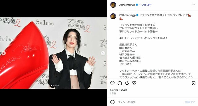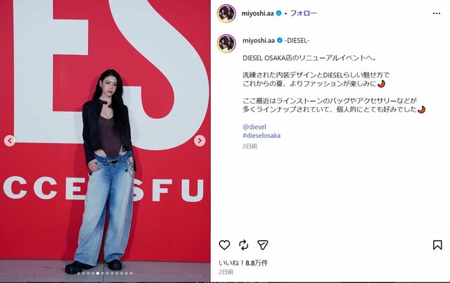 4月25日、インスタグラムでハイレグのボディスーツにゆるっとしたデニムを合わせた最先端ファッションを披露した。彼女は、20日に背中にタトゥーを入れたとインスタで公表し、23日に開催された映画『プラダを着た悪魔2』のジャパンプレミアでは、へそピアスを装着した大胆なコーデで登場。相次ぐイメージチェンジにSNSでは驚きの声が広がっている。