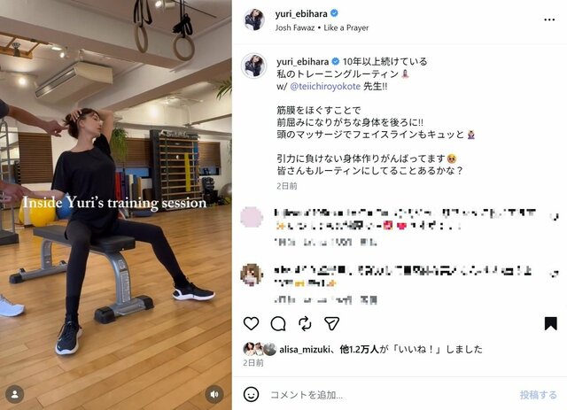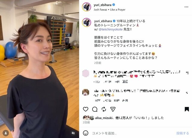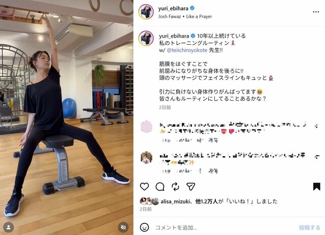 モデルの蛯原友里(46)がインスタグラムを更新。タイトなレギンス姿でのトレーニング風景を公開すると、ファンからは《ただただ美しい》《当たり前だけど改めてスタイル良いな〜》《努力されてるからいつまでも綺麗なんですね!》といったコメントが寄せられた。