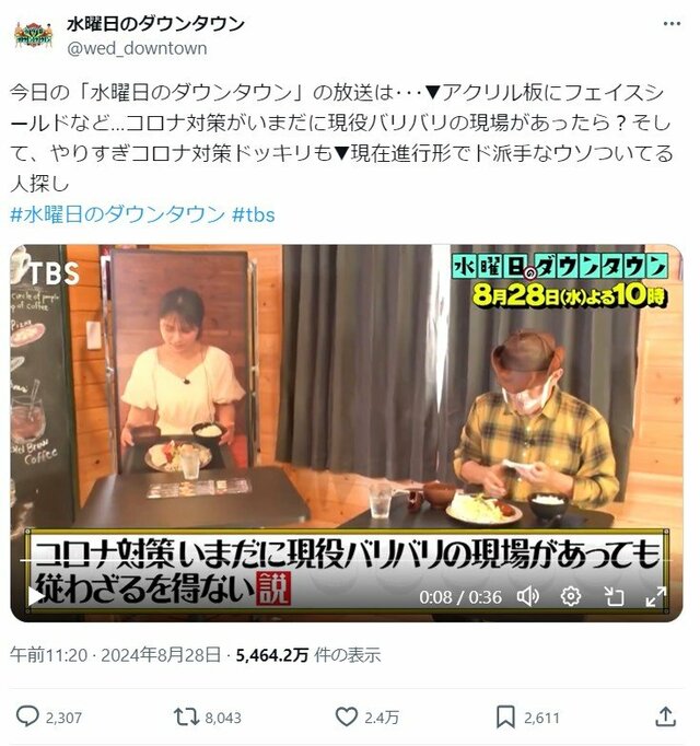 コロナ第11波の中…過去の対策をイジった『水曜日のダウンタウン』から大手企業がスポンサー撤退 取材に「不快感を与える内容」 ピンズバNEWS編集部 2024.9.19 テレビ&ラジオ お笑い エンタメ (3/3ページ) 1ページ目から読む ■【画像】『水ダウ』出演の元アイドル、意味深すぎる”灰皿隠し”直後のおとぼけ食事シーン さりげなく画面外に灰皿を隠した直後の渋谷凪咲。《自然な灰皿をフレームアウトさせる演技さすが》《本筋と関係ない渋谷凪咲のタバコネタがオモロい》と、話題になった。渋谷の“喫煙”はあくまでもネタのようだ。 ※画像は『水曜日のダウンタウン』の公式X『@wed_downtown』より この画像の記事を読む 1 2 3