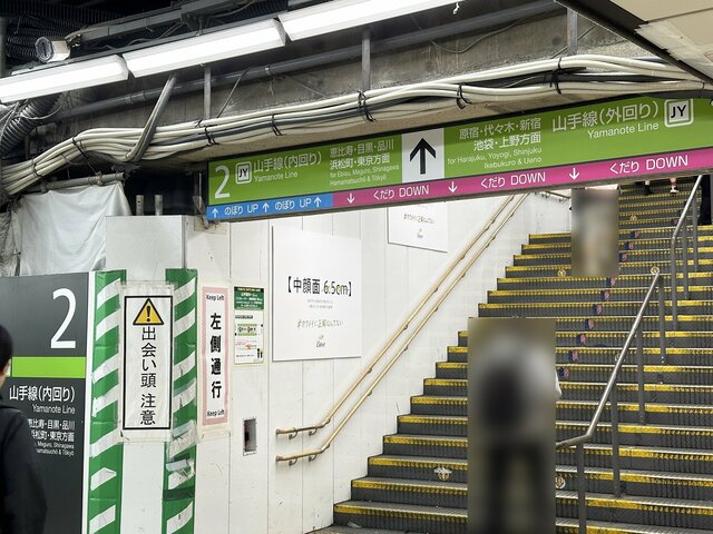 JR東日本渋谷駅の改札内と、東急田園都市線渋谷駅構内に掲出された広告。“美の基準”ワードは「Eライン」「サイギャップあり」「バッカルコリドーなし」「中顔面6.5cm」「遠心顔/求心顔」「出目」「顔の大きさ17cm」「スペ110」「人中短い」「目と目の間が4cm」の全10種で、“必要ない基準”部分には取り消し線が引かれている。