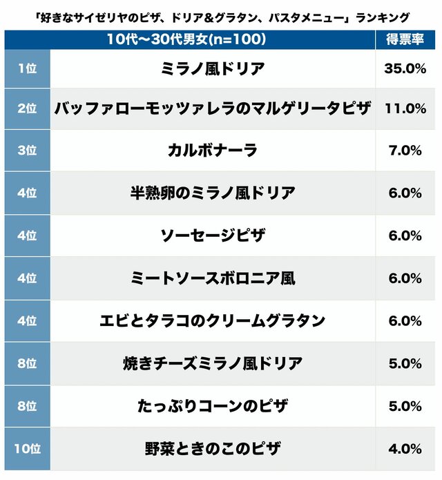 トップはコスパだけじゃない愛されメニューは、10~30代男女が「好きなサイゼリヤのピザ、ドリア&グラタン、パスタ」【トップ3】 ピンズバNEWS編集部 2024.10.28 グルメ ライフ (4/4ページ) 1ページ目から読む ■【画像】「好きなサイゼリヤのピザ、ドリア&グラタン、パスタ」、コスパだけじゃないトップの愛されメニューは? 圧倒的得票率で「ミラノ風ドリア」がトップに。 この画像の記事を読む 1 2 3 4