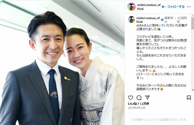 通算2636勝の天才騎手妻・41歳元フジテレビ美人アナが1月期・波瑠主演の古巣ドラマで“女優デビュー”へ ピンズバNEWS編集部 2024.11.28 女子アナ テレビ&ラジオ テレビドラマ (3/3ページ) 1ページ目から読む ■【画像】“ドラマデビュー”41歳元フジ美人アナと通算2636勝の天才騎手のラブラブすぎる2ショット■ JRA通算2636勝(歴代4位)の勝ち星を記録し、引退後は調教師として活動している天才騎手・福永祐一氏。妻で元フジテレビアナウンサーの松尾翠は、25年1月期にフジテレビでドラマデビューすると言われている。 ※画像は松尾翠の公式インスタグラム『@midori.matsuo_official』より この画像の記事を読む 1 2 3