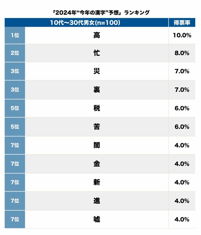 10~30代男女が予想する「今年の漢字」、裏金問題の“裏”を超えネガティブワードがトップに【トップ4】 ピンズバNEWS編集部 2024.12.1 ライフ (4/4ページ) 1ページ目から読む ■【一覧表】「“今年の漢字”」予想、裏金問題の“裏”超えネガティブワードがトップは? この画像の記事を読む 1 2 3 4
