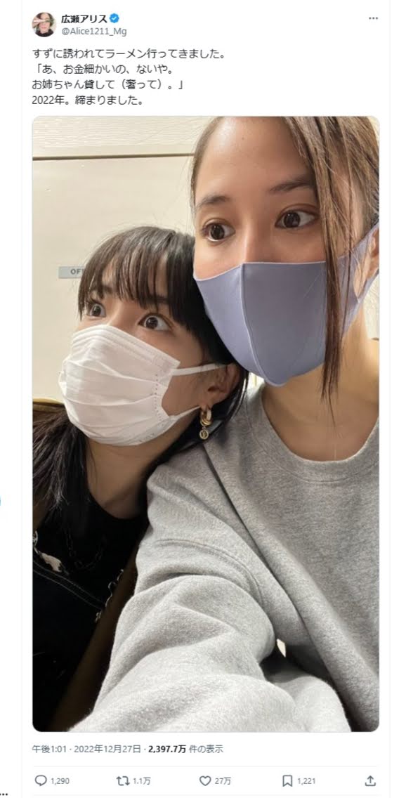 10~30代女性が選ぶ「最強の芸能人姉妹」、木村拓哉と工藤静香の娘・Cocomi&Koki,超え姉妹は【トップ3】 ピンズバNEWS編集部 2024.12.2 女優 (4/4ページ) 1ページ目から読む ■【画像】女子が選ぶ「最強の芸能人姉妹」、木村拓哉と工藤静香の娘・Cocomi&Koki,超え姉妹は? 広瀬アリスが公開した妹・広瀬すずとの2ショット。 広瀬アリス公式X(@Alice1211_Mg)より この画像の記事を読む 1 2 3 4