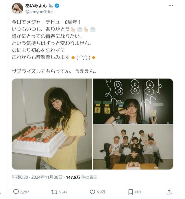 10~30代男女が「『紅白歌合戦』で楽しみなアーティスト」、『Bling-Bang-Bang-Born』が“流行語”Creepy Nuts超えは【トップ4】 ピンズバNEWS編集部 2024.12.11 アーティスト (4/4ページ) 1ページ目から読む ■【画像】「『紅白歌合戦』で楽しみなアーティスト」、『Bling-Bang-Bang-Born』が“流行語”Creepy Nuts超えトップの笑顔ショット あいみょんは今年6度目の『紅白』出演。どんなステージを見せてくれるのか今から楽しみだ。 あいみょん公式X(@aimyonGtter)より この画像の記事を読む 1 2 3 4