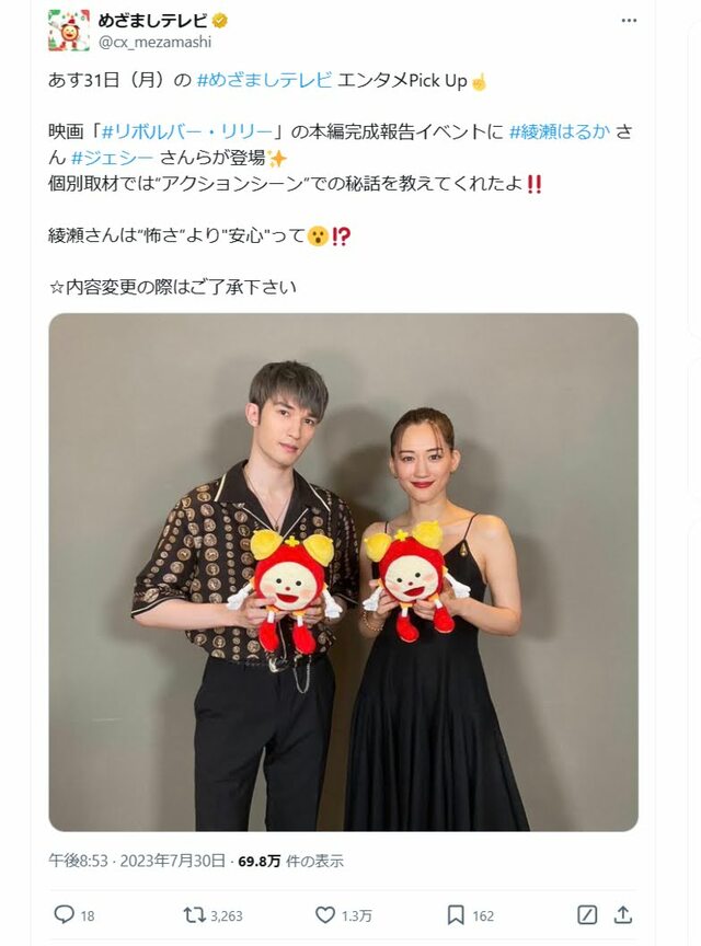 10~30代女性が注目「年内に電撃結婚しそうな女性芸能人」、橋本環奈と広瀬すずを抑えた好感度女優は【トップ3】 ピンズバNEWS編集部 2024.12.15 女優 ジャニーズ 俳優 (4/4ページ) 1ページ目から読む ■【画像】「年内に電撃結婚しそうな女性芸能人」、橋本環奈と広瀬すずを抑えた好感度女優“噂の相手”とのツーショット 綾瀬はジェシーと、23年8月公開の映画『リボルバー・リリー』で共演、それが交際のきっかけだったといわれている。画像は、当時『めざましテレビ』(フジテレビ系)にて映画の告知を行なっていた際の2人。 めざましテレビ公式X(@cx_mezamashi)より この画像の記事を読む 1 2 3 4