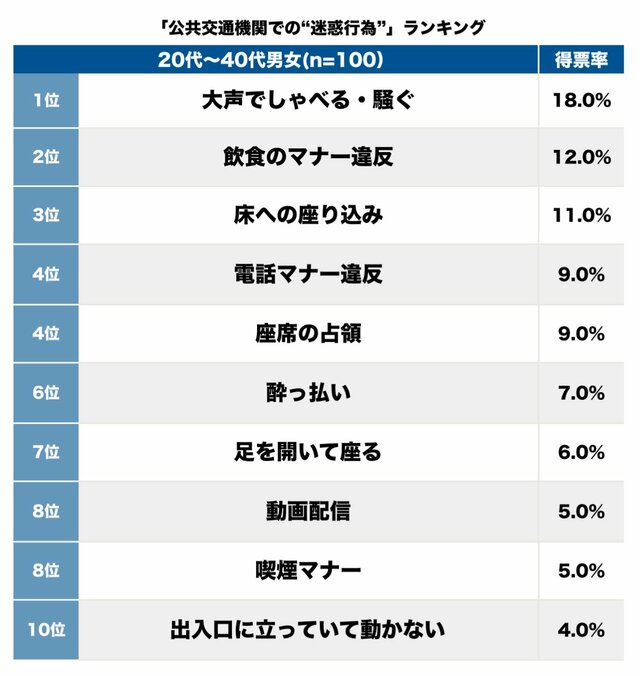 男女100人が憤る「公共交通機関での“迷惑行為”」、床に座り込む、車内で飲食より厄介なのは【トップ3】 ピンズバNEWS編集部 2024.12.19 ライフ (4/4ページ) 1ページ目から読む ■【一覧表】「公共交通機関での“迷惑行為”」、床に座り込む、車内飲食よりNGなのは? この画像の記事を読む 1 2 3 4
