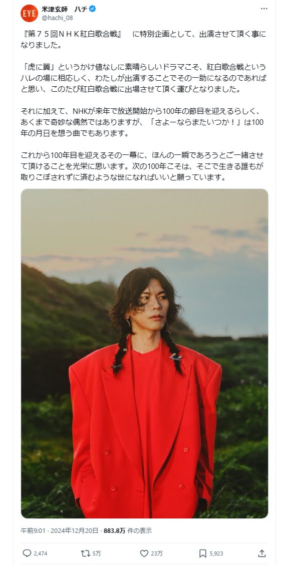 若者100人が「大みそかに見たい番組」、『孤独のグルメ』を超えた、いまだ“定番”の鉄板番組【トップ3】 ピンズバNEWS編集部 2024.12.29 テレビ&ラジオ テレビドラマ その他イケメン (4/4ページ) 1ページ目から読む ■【画像】「大みそかに見たい番組」トップに出演アーティスト、イケメンすぎるミステリアス横顔ショット 米津玄師は、『NHK紅白歌合戦』特別企画でNHK連続テレビ小説『虎に翼』の主題歌『さよーならまたいつか!』を披露する。 米津玄師 ハチ 公式X(@hachi_08)より この画像の記事を読む 1 2 3 4