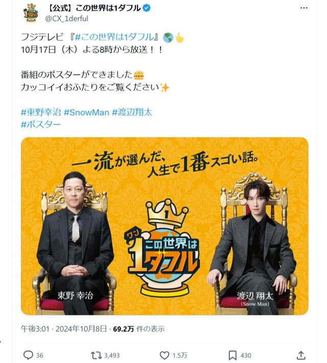 20~30代が「好きじゃない芸人MC」、大活躍の若手でもあるかまいたち・濱家を抑えたベテランは【トップ3】 ピンズバNEWS編集部 2025.1.10 お笑い (4/4ページ) 1ページ目から読む ■【画像】「好きじゃない芸人MC」、かまいたち・濱家を抑えたトップのベテラン芸人 東野幸治は、2024年10月にSnowMan渡辺翔太とMCを務める『この世界は1ダフル』(フジテレビ系)もスタートした。 この世界は1ダフル【公式】X(@CX_1derful)より この画像の記事を読む 1 2 3 4