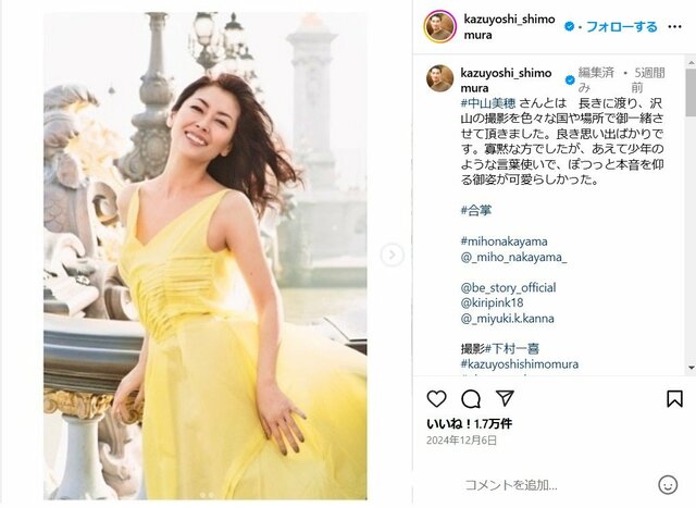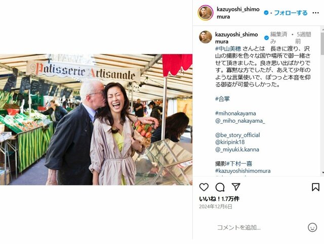 中山美穂さん逝去からもうすぐ2か月、香取慎吾ドラマに大注目が 妹・中山忍に引き継がれた美穂さんの“嫌~な女”熱演 ピンズバNEWS編集部 2025.1.31 テレビ&ラジオ テレビドラマ 女優 (3/3ページ) 1ページ目から読む ■【画像】「悲しいぐらい美しい」中山美穂さんのキスにはにかむ生前ショット 美しいビジュアルと明るいキャラクターで親しまれていた中山美穂さん。そんな彼女らしさが感じられるショットに《悲しいぐらい美しい》《本当に素晴らしいですね 中山さんの美しさを引き立てている》との反応も。中山さんの早すぎる逝去に、悲しみの声が止まない。 カメラマンは、写真家の下村一喜氏。 ※画像は下村一喜氏の公式インスタグラムより(以下同) この画像の記事を読む 1 2 3