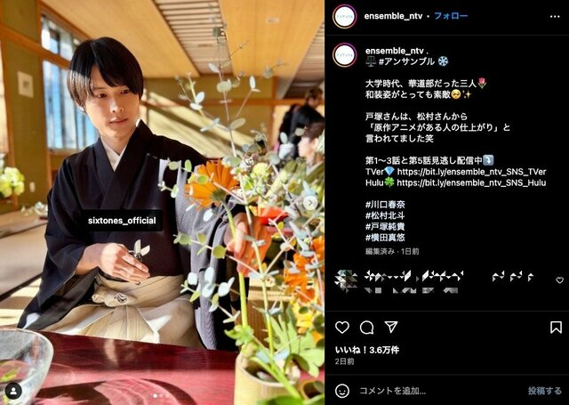 川口春奈・松村北斗の高い演技力『アンサンブル』 ツッコミが止まらない珍ドラマなのに視聴率・配信が好調な2つの意外な理由 ドラマライター・ヤマカワ 2025.2.22 テレビドラマ (3/3ページ) 1ページ目から読む ■【画像】SixTONES・松村北斗「どこのおぼっちゃま?」和装で花をいける姿がビジュ爆発の美しさ こんな姿を映されたら、そりゃ見ちゃいますね。 ※画像は『アンサンブル』公式インスタグラムアカウントより ■日本テレビ『アンサンブル』公式サイト この画像の記事を読む 1 2 3
