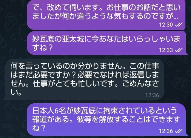 日本人高校生2人を保護、タイ・ミャンマー国境「監禁闇バイト」の実態 ピンズバNEWS編集部 2025.3.3 事件 国際・外交 (4/4ページ) 1ページ目から読む ■【画像】タイ・ミャンマー国境の特殊詐欺集団との実際のやりとり 特殊詐欺施設からの日本人解放交渉を試みたライターのビリー高橋氏(妙瓦底=ミャワディ) (画像は本人提供) この画像の記事を読む 1 2 3 4